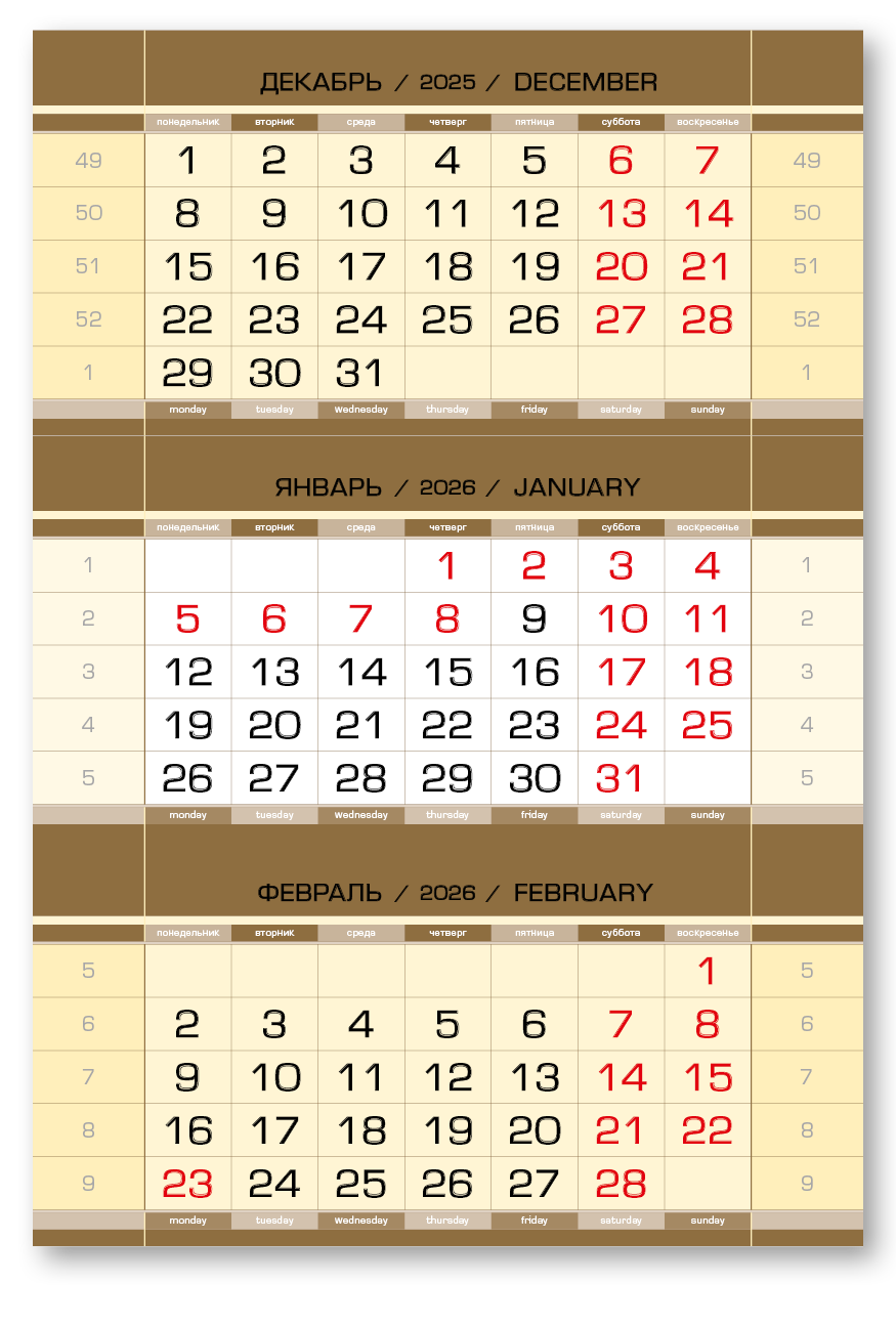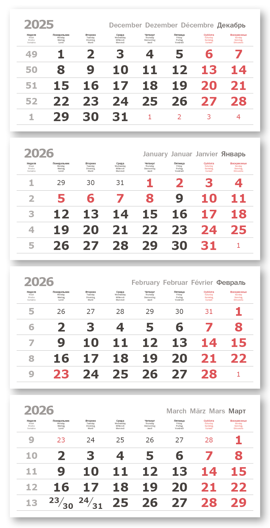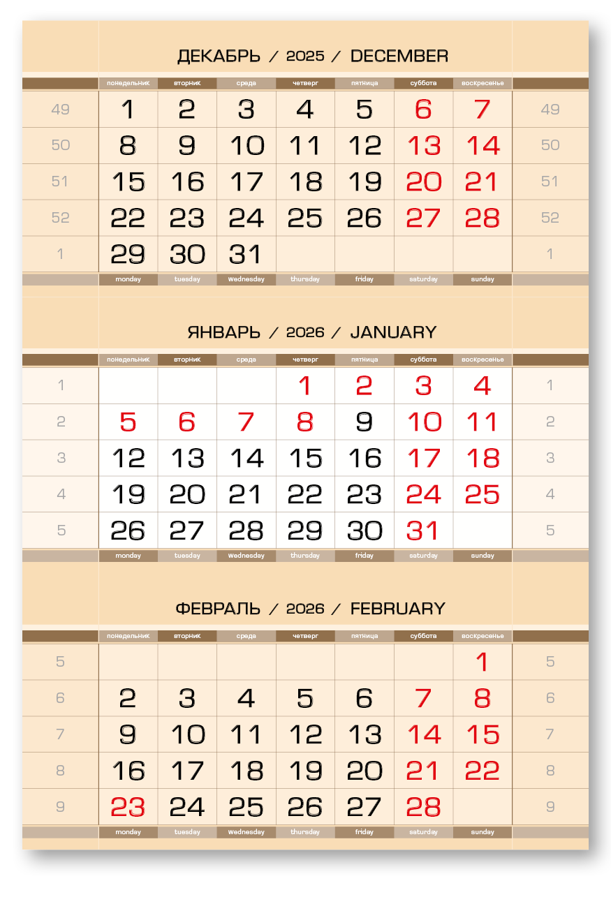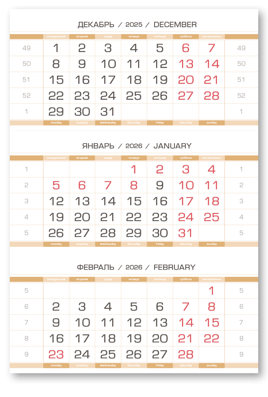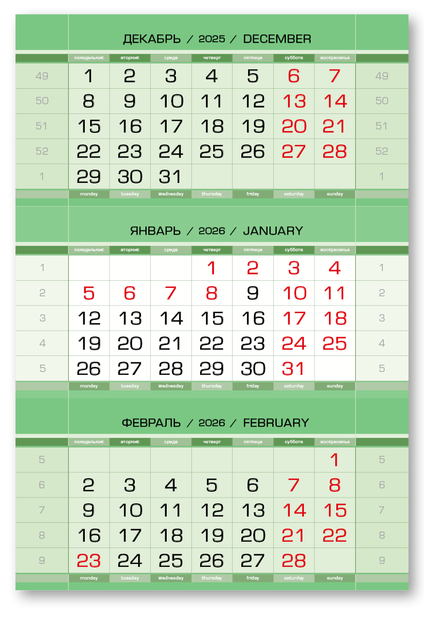 Мы производим квартальные календари на собственном производстве в Пушкине. Наши календари выгодно отличаются ламинированным глянцевой или матовой пленкой шпигелем (шапкой), уникальными календарными блоками, ярким запоминающимся дизайном, а главное — ценой.